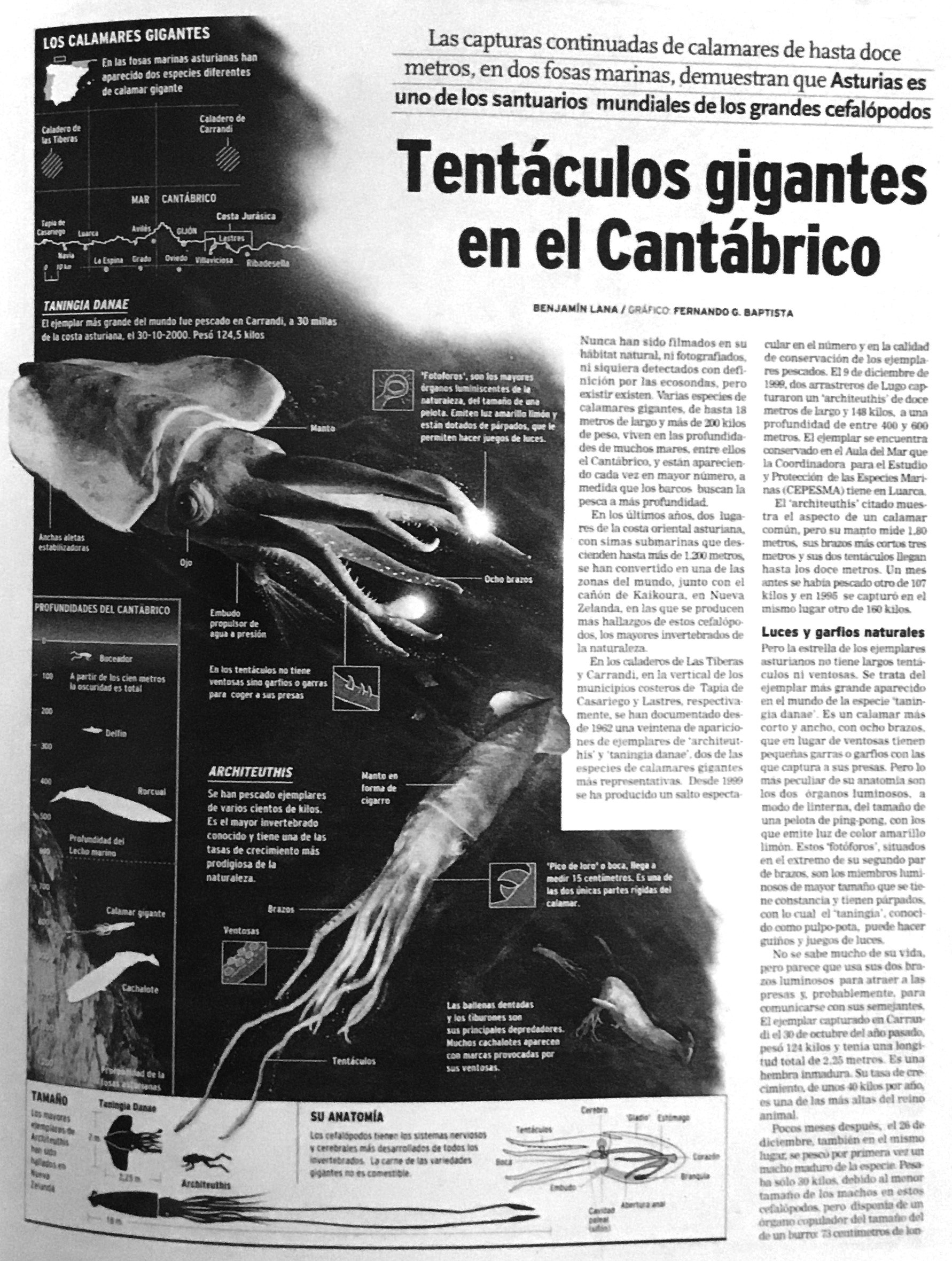 Nuestro invitado comenzó su carrera como infografista en el diario El Correo de Bilbao, en el año 1993. Allí ya empezó a experimentar con el uso de esculturas como en esta infografía "Tentáculos gigantes en el Cantábrico" del 19 de marzo del 2001.