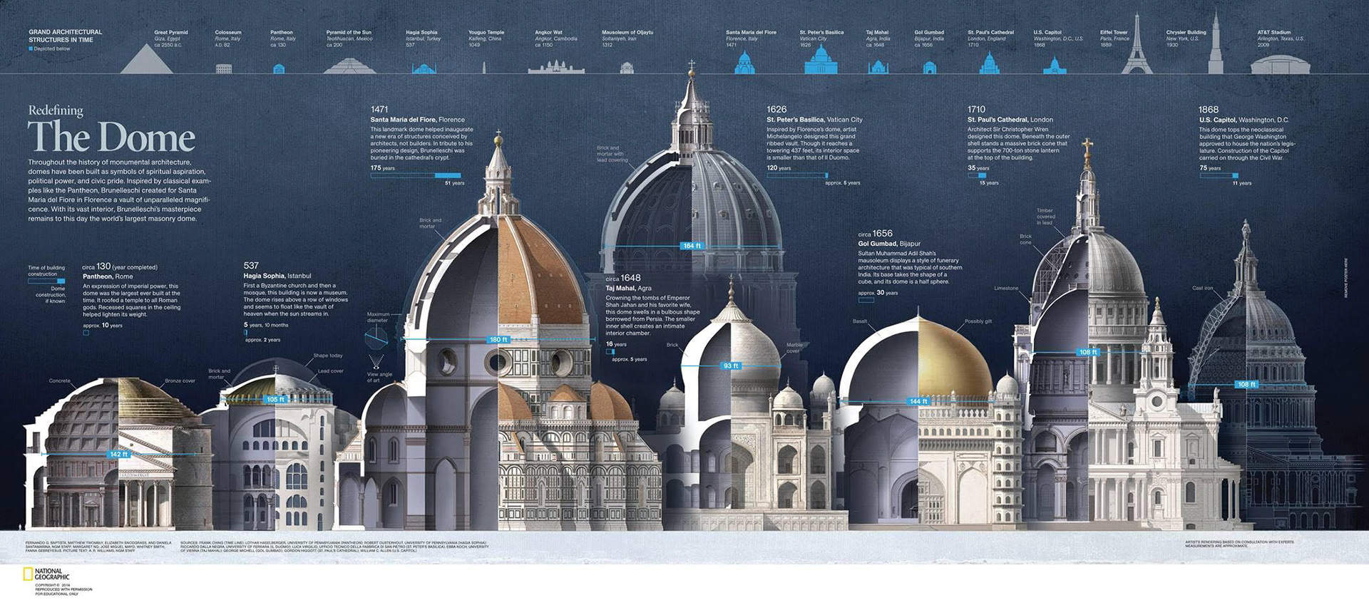 "How an Amateur Built the World's Biggest Dome" de enero del 2014 nos muestra la historia de la construcción de la cúpula de Santa María del Fiore, también conocida como cúpula del Duomo de Florencia. Más abajo está la versión impresa para la revista National Geographic.