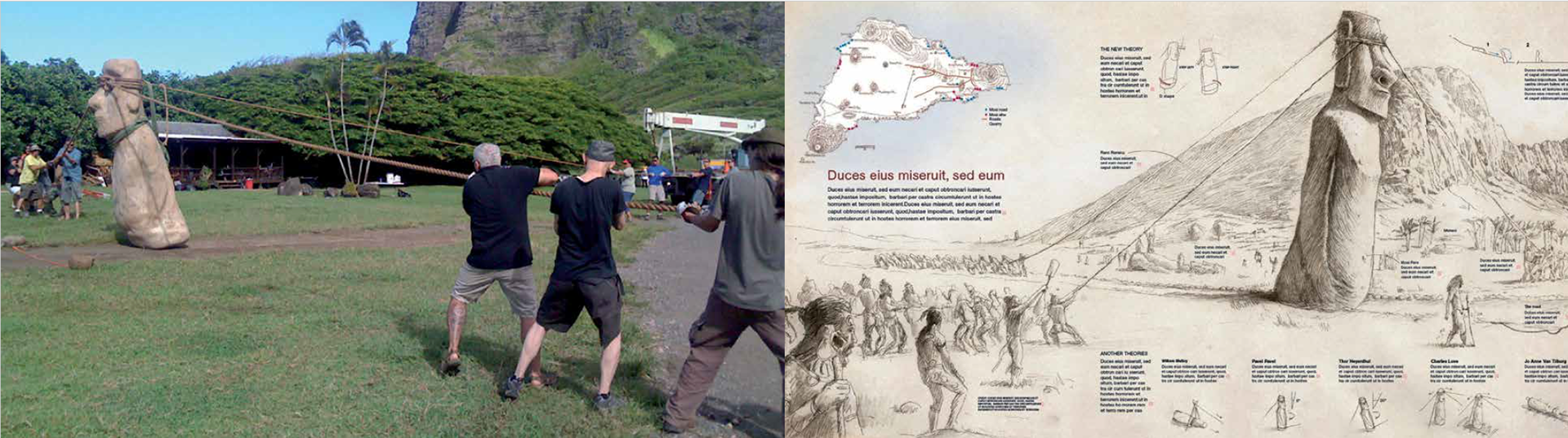 "Walking with giants: How the Easter Island Moai Moved" de agosto del 2012, fue la primera infografía en stop motion para National Geographic. El infografista pudo participar del experimento que ayudó a demostrar la teoría más aceptada sobre estas misteriosas estatuas de la Isla de Pascua.