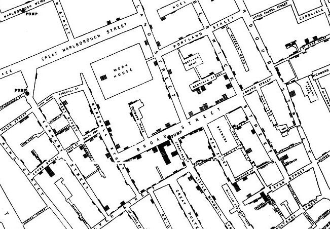 Mapa del brote de cólera en el barrio del Soho de Londres en 1854 por el Doctor John Snow. Se pueden observar las líneas dibujadas sobre cada propiedad que indica la cantidad de fallecidos. Al centro, donde dice "PUMP", se marca la ubicación de la bomba de agua que abastecía a la zona. La contaminación de dicha bomba provocó la muerte de 700 personas en una semana.