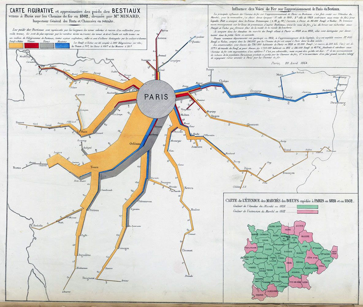 "Mapa figurativo y aproximativo de de los pesos del ganado llegado a París en tren en 1862" fechado en 1864. El código de colores señala el tipo de ganado y la anchura de los flujos determinan las cantidades: 1 milímetro equivale a 1.000 toneladas.