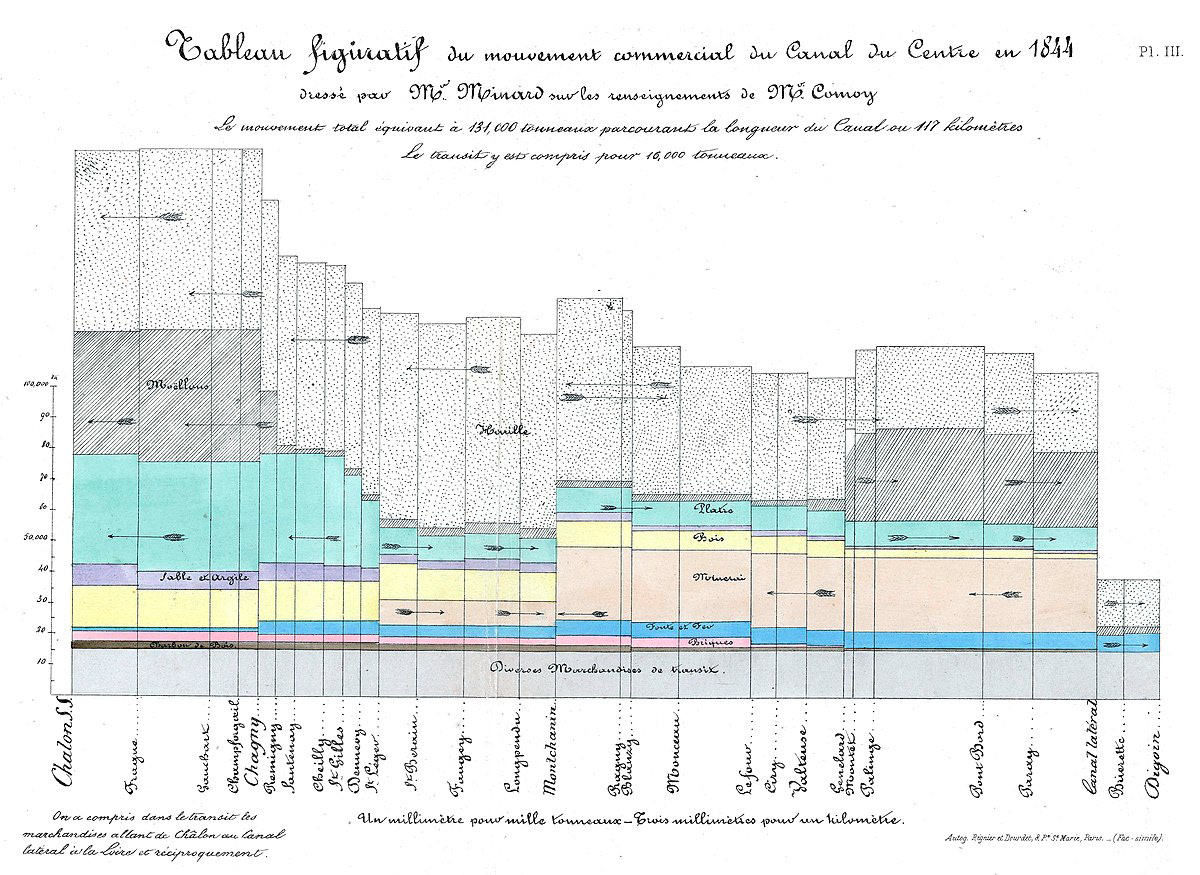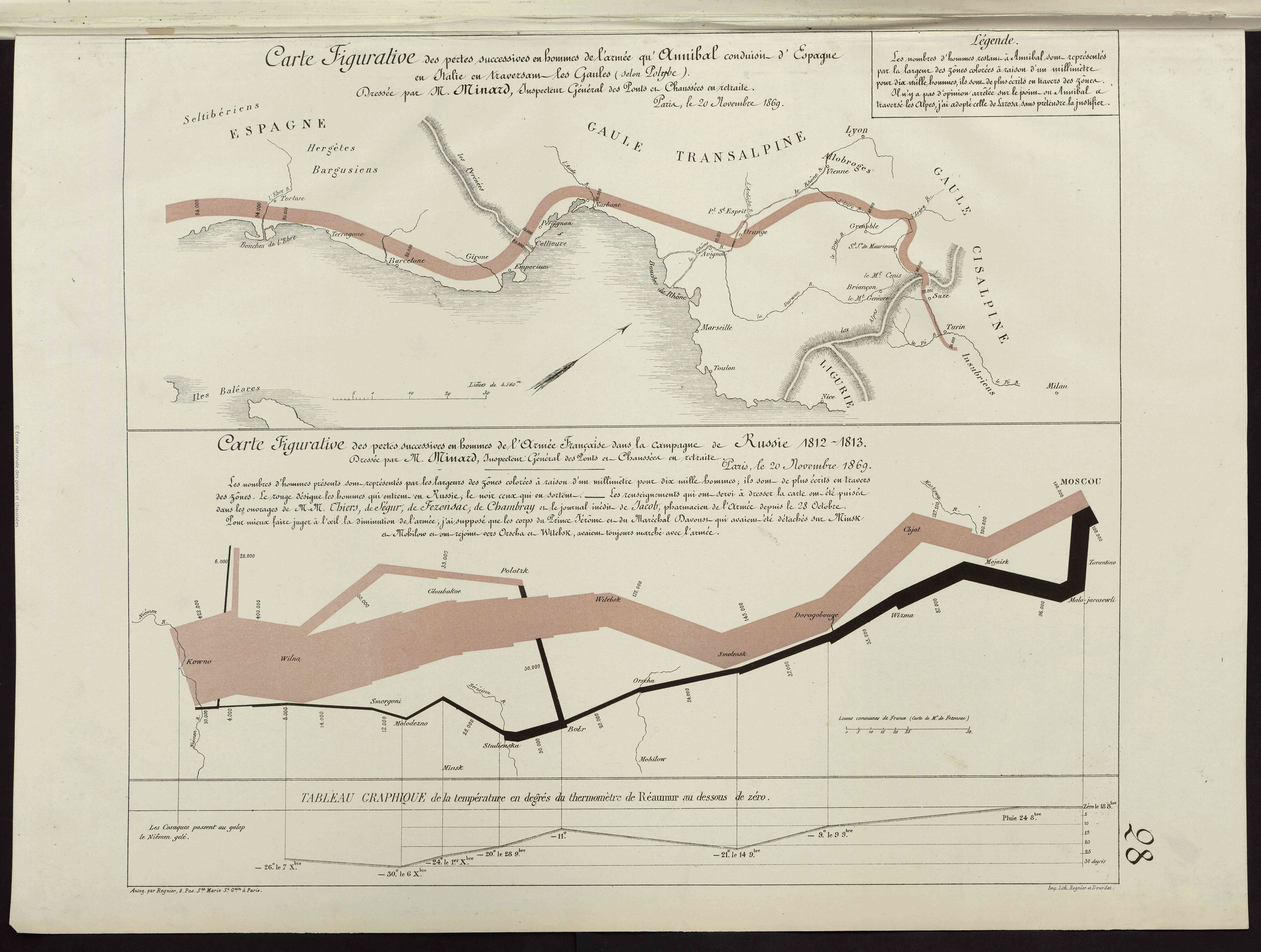 El famoso gráfico de Charles Joseph Minard (abajo) “Mapa figurativo de las sucesivas pérdidas de hombres de la armada francesa en la campaña de Rusia de Napoleón en 1812” (Carte figurative des pertes successives en hommes de l’Armée Française dans la campagne de Russie 1812-1813) fue publicado en 1869. Venía con otro mapa figurativo sobre la marcha de Aníbal de España a Italia (arriba) en donde también sufrió numerosas pérdidas. Michael Friendly sostiene que estos dos mapas figurativos fueron publicados así para ser comparados.